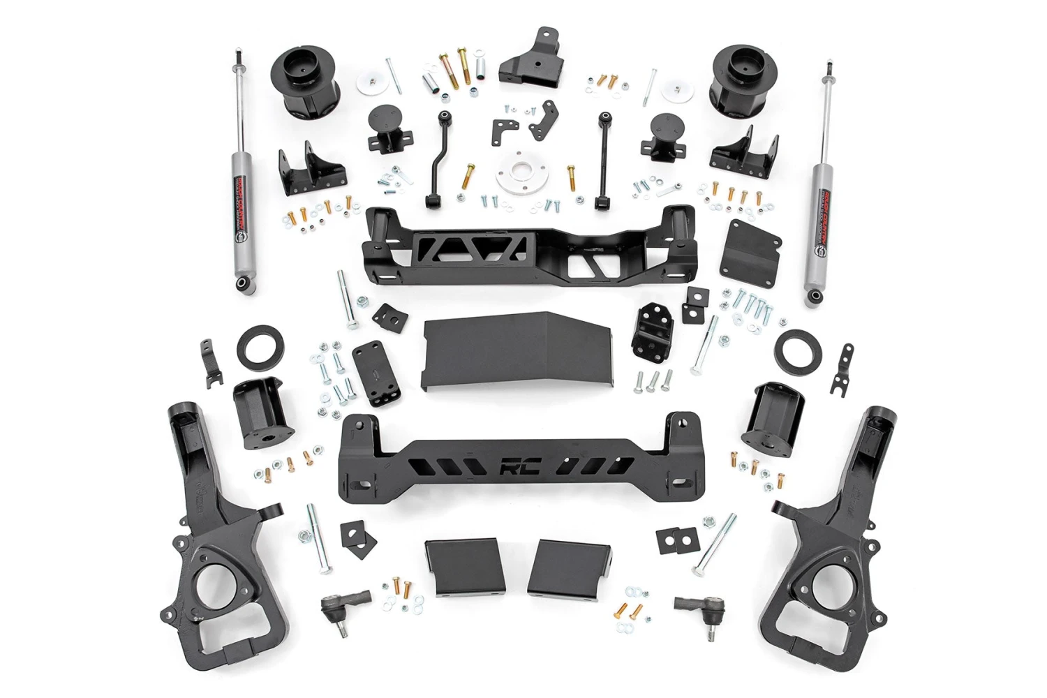 - Front Components: Lifted knuckles, Strut spacers, Front crossmember, Differential drop brackets, Driveshaft spacer, Sway-bar links, Skid plate, Hardware