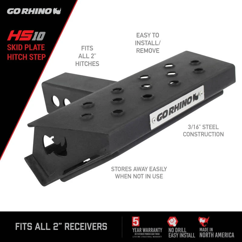 A Go Rhino hitch step provides easy rear step access to a truck bed, SUV and they offer protection to vulnerable, molded bumpers in the event of a collision. The Go Rhino hitch step family has a lot of styles from which to choose. The RB Series makes the perfect accessory to the popular RB and RB Slim running boards and comes in two matching finishes. The modern HS Series ranges from the spring loaded, flip down step of the HS-20 to the modern, minimal HS-30 and the rugged, skid plated HS-10. With tubular classics like the Rhino Step, Dominator Series, 360 Series and 4″ Oval Series, Go Rhino has continued to show why it is the industry leader in hitch steps. The Hitch Steps come with a Limited Lifetime warranty on materials and construction and a 5 year warranty on the Textured Black Finish.