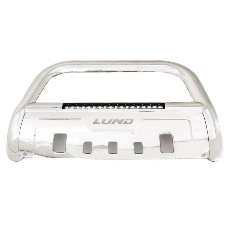 Protects your front end from flying debris with 3.5 inches of oval steel tubing. These bull bars also boost your visibility with an integrated 20 in. LED light bar. The included heavy duty light bar illuminates your night driving with a bright flood beam pattern and is easily wired into your factory light wiring, or a wiring harness can be purchased separately. Available in black textured powder coat or polished T304 stainless steel finish. Our popular LUND bull bars may now be ordered with a wire harness kit. The wire harness kit is also sold separately for lighting and accessories up to 30 Amps. LUND’s bull bars with LED light bar and wiring kit is the total package to see and be seen, providing complete front end style, lighting and protection.