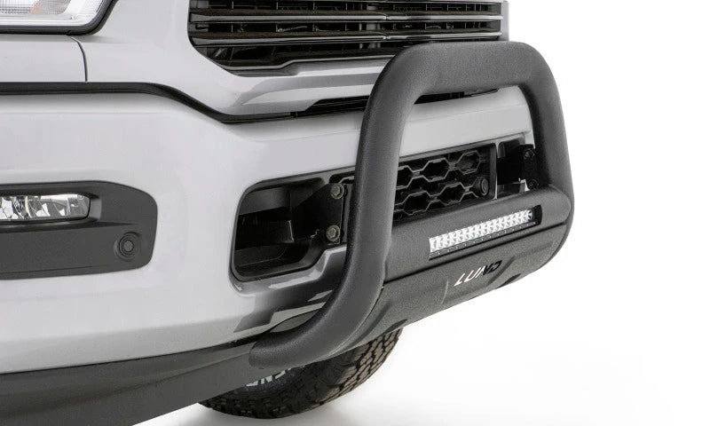 Protects your front end from flying debris with 3.5 inches of oval steel tubing. These bull bars also boost your visibility with an integrated 20 in. LED light bar. The included heavy duty light bar illuminates your night driving with a bright flood beam pattern and is easily wired into your factory light wiring, or a wiring harness can be purchased separately. Available in black textured powder coat or polished T304 stainless steel finish. Our popular LUND bull bars may now be ordered with a wire harness kit. The wire harness kit is also sold separately for lighting and accessories up to 30 Amps. LUND’s bull bars with LED light bar and wiring kit is the total package to see and be seen, providing complete front end style, lighting and protection.