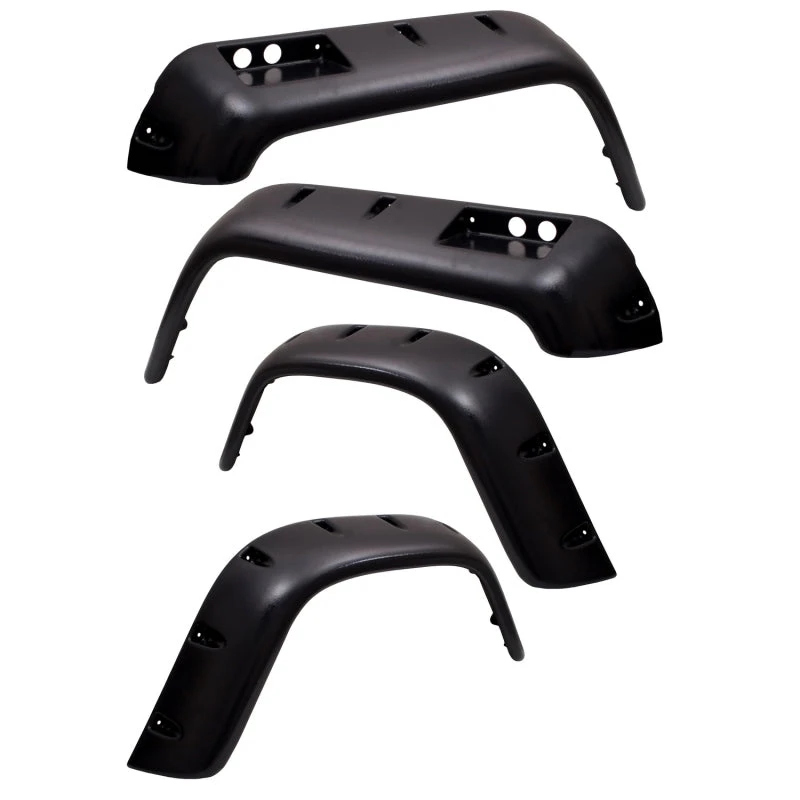 Get that aggressive off road look with the NEW Rugged Ridge All Terrain Fender Flare! These flares feature a stylish design while protecting your vehicles paint from flying rocks and mud. Constructed of durable UV treated ABS with a slight texture, these paintable flares provide a great look while being able to handle whatever nature throws at them. Each All Terrain Flare use durable rust proof stainless fasteners. Backed by an industry leading 5 year limited warranty, All Terrain Flares will really set you apart from the crowd! Drilling Required. Side gas tank filler and side markers may interfere on some models. Drilling required as this kit uses TJ rear flares. (Optional trimming for maximum tire clearance)