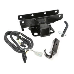 This receiver hitch kit from Rugged Ridge includes a durable powder-coated 2- in. receiver hitch, wiring harness, hitch pin, and a heavy duty black powder coated receiver tow hook that is secured to the receiver hitch– offering a sturdy attachment point for the rear of your Jeep.