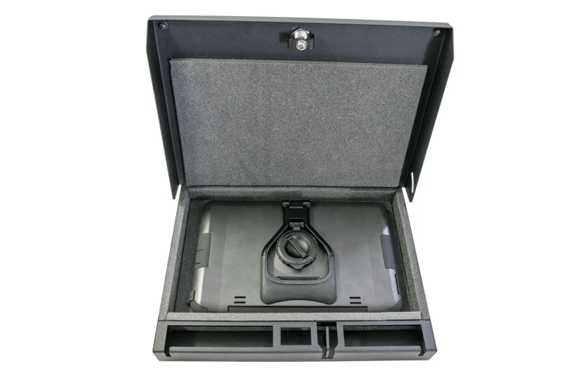 Weighing less than 7 lbs., this lockable welded steel storage box is designed to secure a tablet or firearm and protect valuables while carrying by hand between locations, during travel, inside a vehicle, home or office. Convenient pre-drilled holes allow for easy mounting to solid surfaces including airline cockpits, fleet & service vehicles, home or office environments. Access ports are built in to accommodate power and data transfer cables. Exclusive lid restrictor hinge stop design prevents lid from dropping open when mounted to a solid surface and can be quickly removed to open the lid fully when on the go. The lid restrictor kit allows either 3 inch or 5 inch lid opening, if desired. Keyless entry is provided by Tuffy’s 3 digit combination lock with a two-point steel cam for added security. The included 2 ft. long, 2000 pound test, steel security cable secures the safe to any sturdy mounting surface by attaching to the 1/8 inch steel security cable anchor point. The inside is lined with low-density foam to protect the contents, while compression bumpers keep the lid vibration-free when closed.